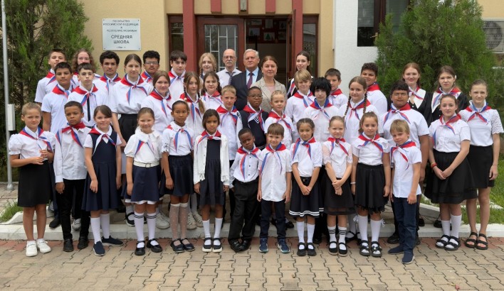 22 декабря на торжественной линейке Чрезвычайный и Полномочный Посол России в Мозамбике Владимир Николаевич Тараров открыл новую традицию. Всем ученикам он лично повязал галстуки расцветки российского триколора, символизирующие верность нашему Отечеству, традициям и обычаям, причастность к подвигам и к славе российского государства и российского народа.
